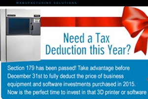 Do you know what Section 179 is? It’s a tax code that was created to help businesses. If you take advantage of it before December 31st you can fully deduct the price of business equipment and software investments purchased this year (2015). That makes now the perfect time to invest in a new 3D printer or software that your business could really use. Here is a quick overview of Section 179. Section 179 is a tax code created to help businesses. By allowing businesses to deduct the full amount of the purchase price of equipment (up to certain limits), Section 179 is a fantastic incentive for businesses to purchase, finance or lease equipment this year. Section 179 is valid on most types of equipment. There is little sense in allowing a deduction on only obscure equipment, so Section 179 is aimed at general business equipment as well as off-the-shelf software. If you use it in your business, it probably qualifies. Section 179 can greatly help your bottom line. By deducting the full cost, you lower the amount you pay for equipment and/or software substantially. And these benefits can be further expanded if you choose to lease or finance your equipment & software. Section 179 is simple [...]