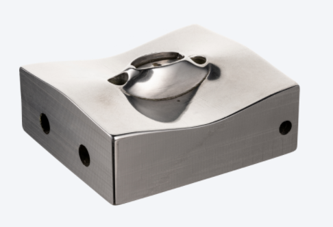 Due to the hard plastic that is being injected, this mold was printed in H13 tool steel to give it significantly higher wear resistance. A very difficult metal to machine, H13 can cause considerable tool wear and a very slow feed rate. Printing this part to near net shape allowed for a 95% reduction in the CNC machining required – the only need was to touch up critical surfaces and dimensions after sintering. This led to significant cost savings for this part, even when compared to a version without the internal cooling channel.