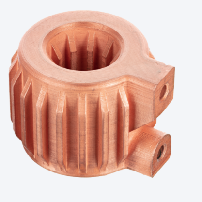 This cooling channel substantially increases the part’s heat transfer rate. External and internal fins – features that cost very little to print, but would add significant cost if the part were machined – were also added to increase heat transfer surface area. Printing the part in copper allowed for excellent thermal conductivity through the heat exchanger.