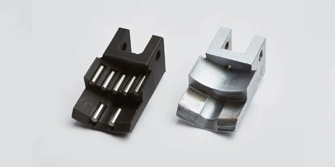 Take these aluminum gripper fingers, which were converted to polymer gripper fingers, and are able to be produced more quickly, at a fraction of the cost – with added, replaceable hardened dowel pins.