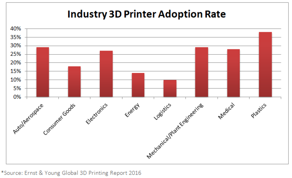 The worldwide 3D printing market value is expected to reach $26 billion in 2022, more than double the approximate industry value in 2018. The combination of declining 3D printer costs, technological advances and increased printer capabilities are set to fuel this expected adoption rate in the upcoming years.